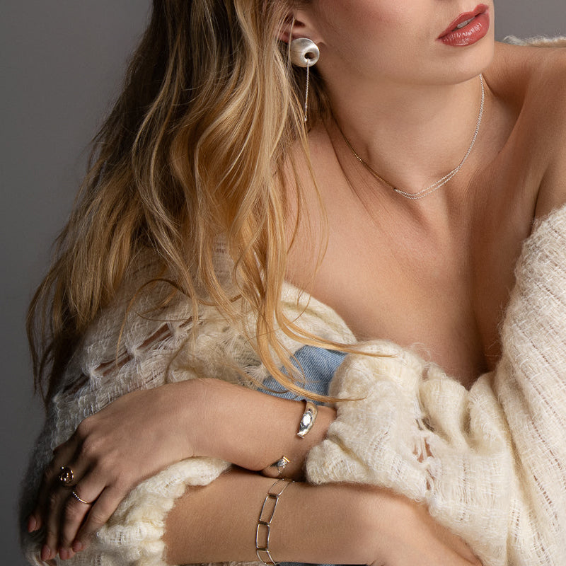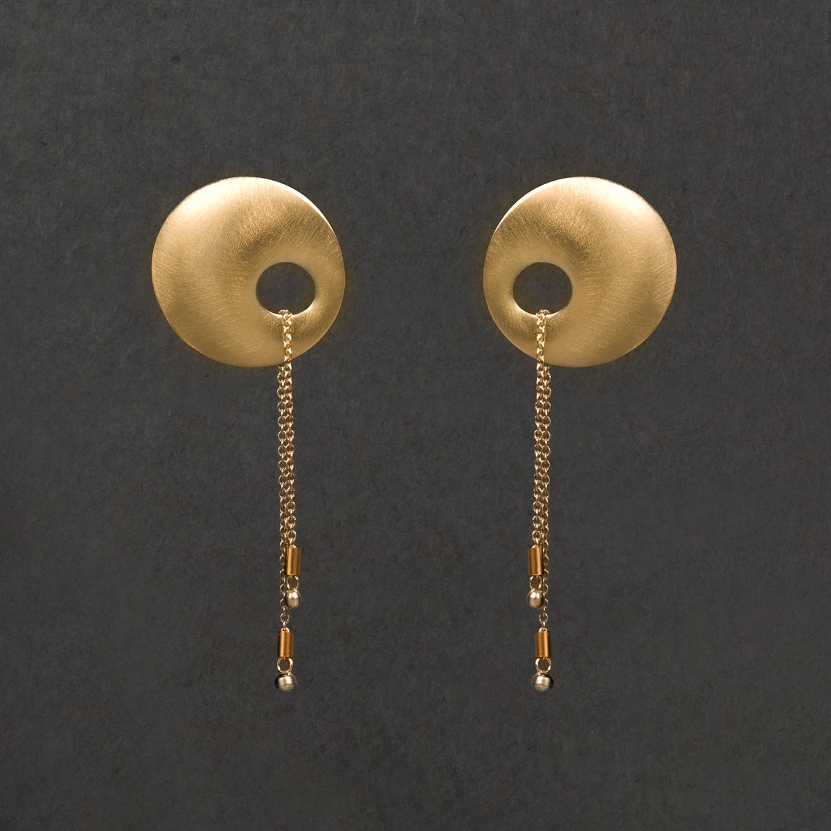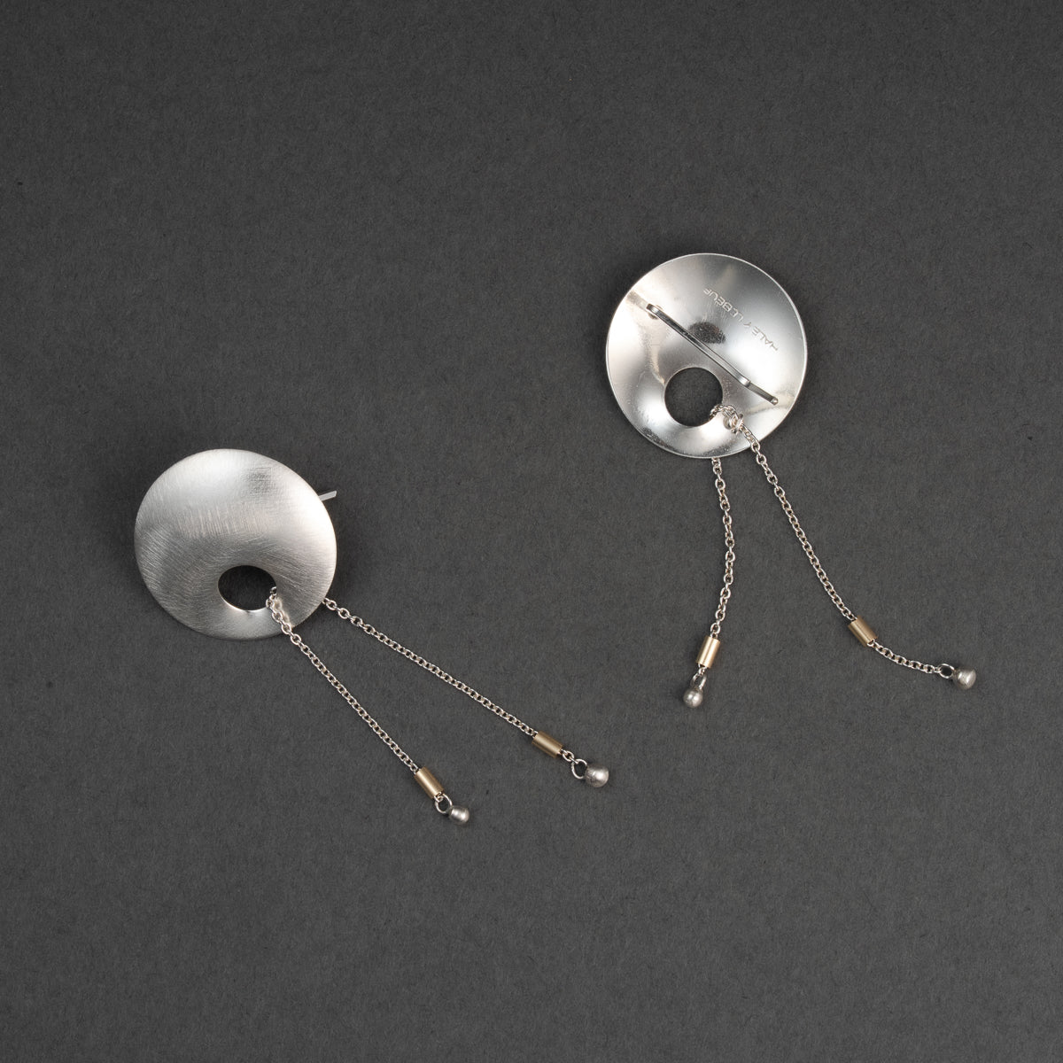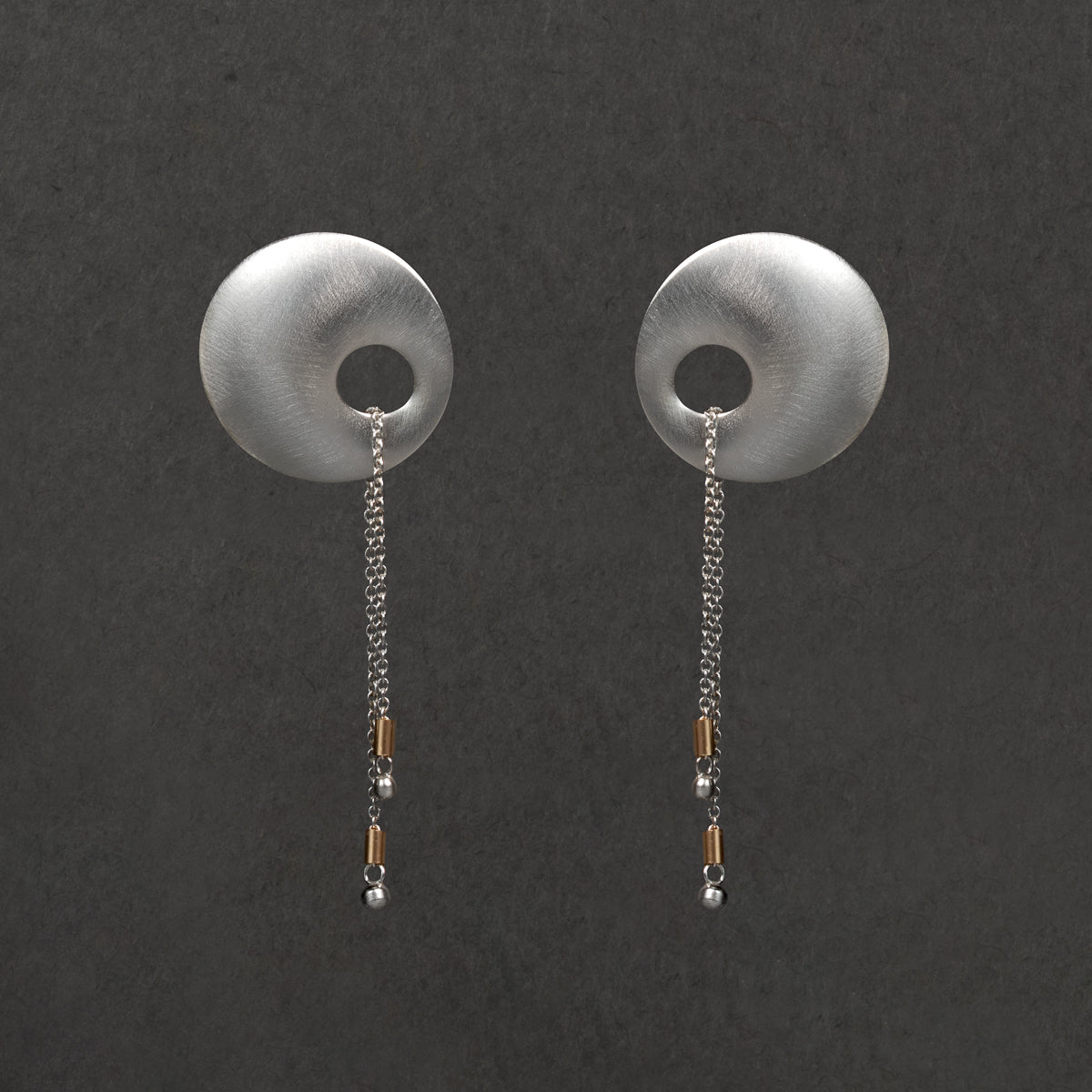 The voluminous earring is 7/8" in diameter and has delightful cable chains that drop to 2 1/4" long with gold-fill tube and silver ball details at the end. It has an ear wire that easily allows them to be worn.