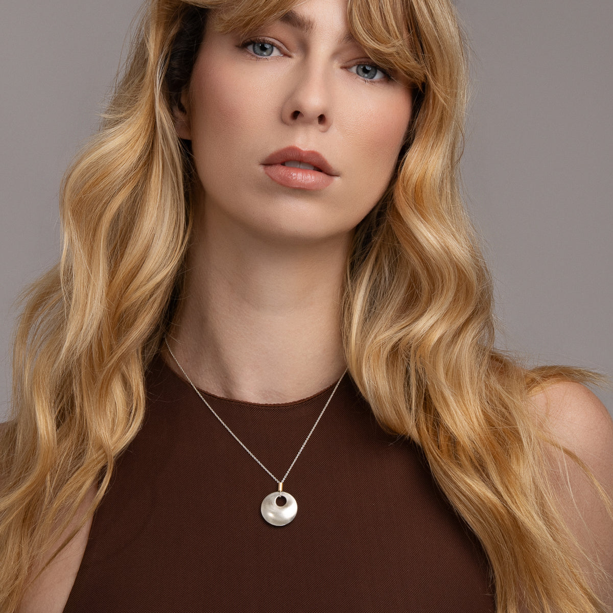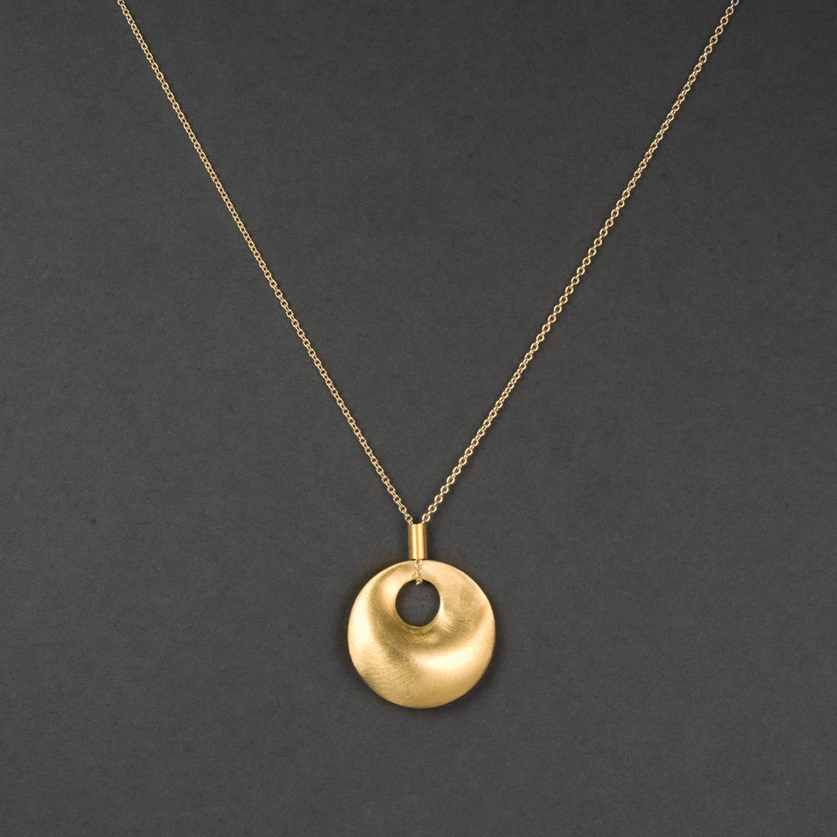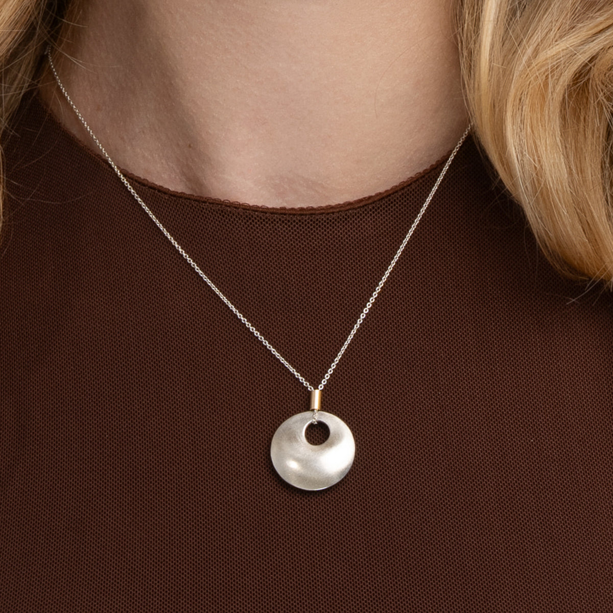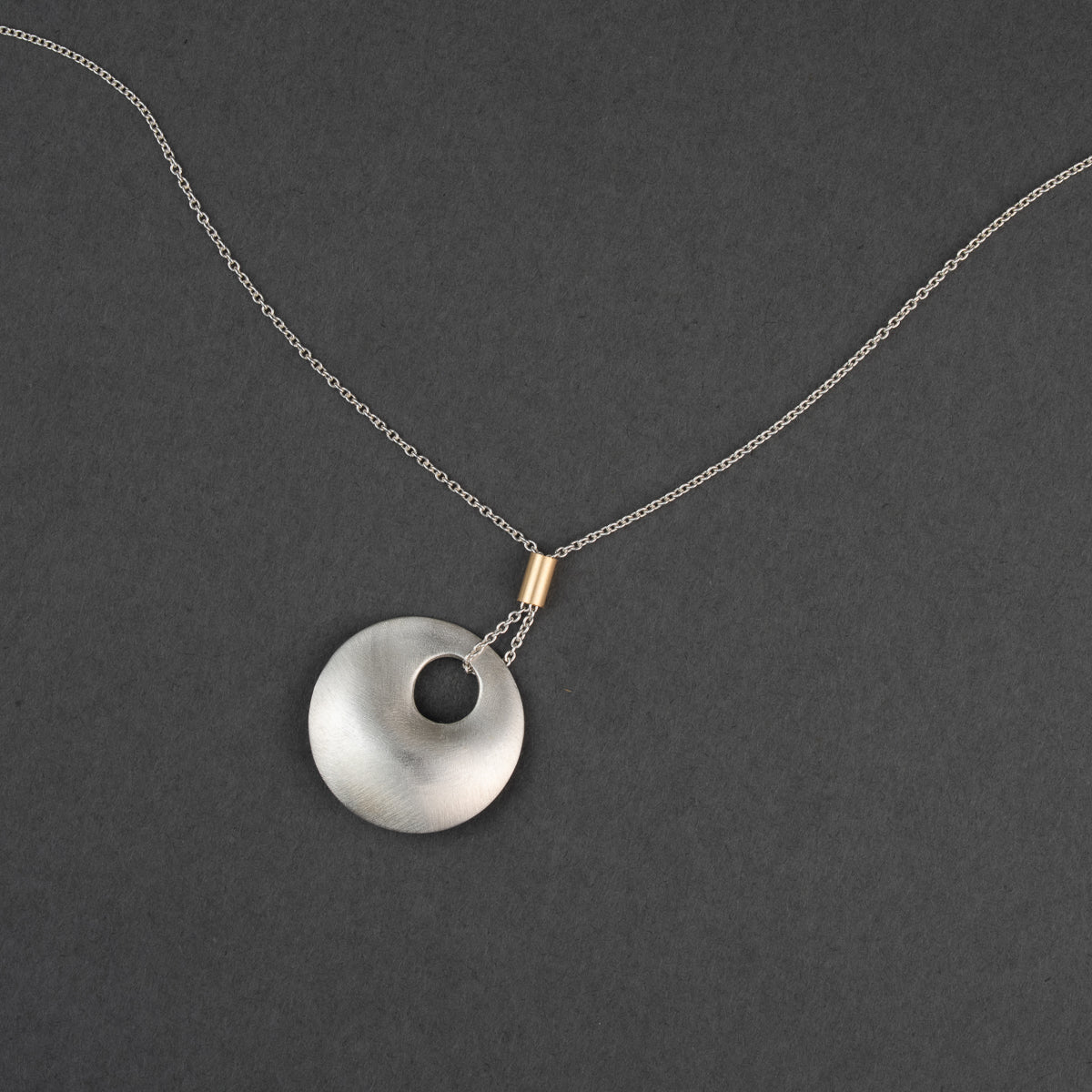 The voluminous hollow form pendant is 7/8" in diameter and about 5mm thick. It has a gold-fill tube detail and a fully adjustable sterling silver cable chain that allows it to be worn up to 18" long. For a deeper drop a 22" adjustable chain is also available.