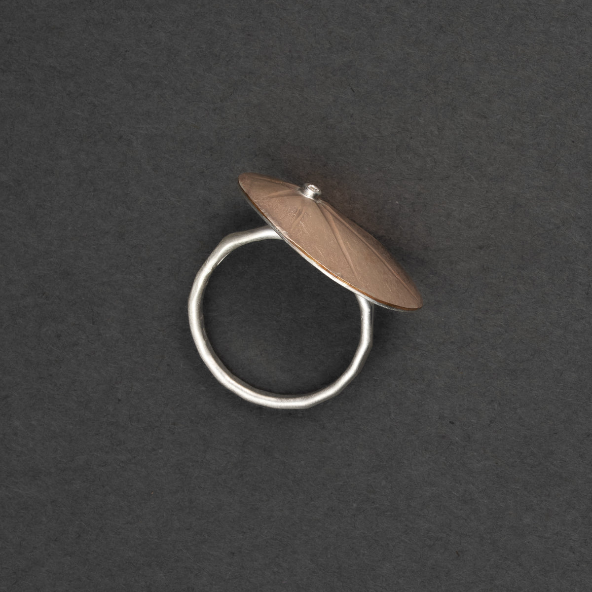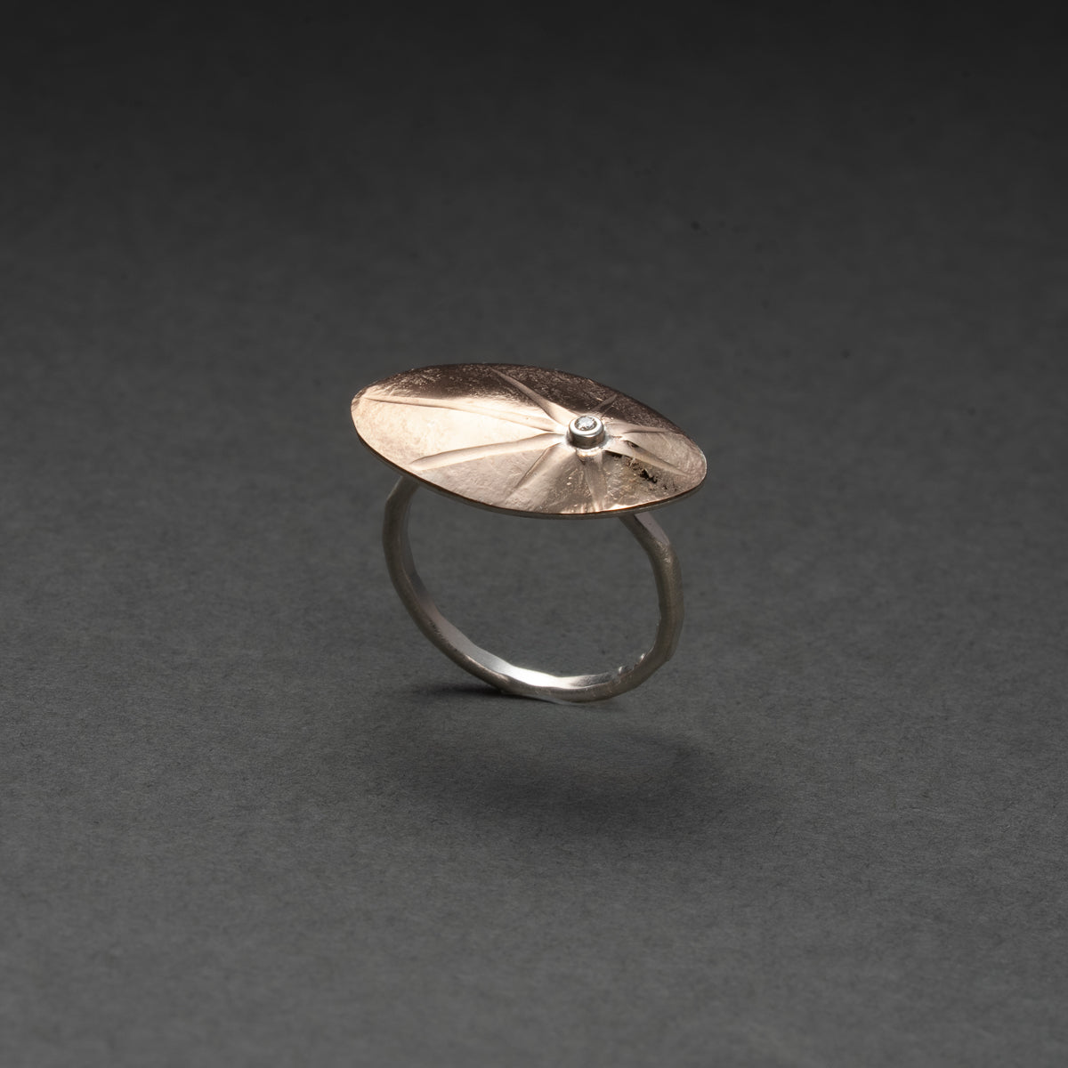 This cocktail ring has a gold-fill top dome that is 23mm long and 14mm wide. The 1.3mm diamond is set in silver and the base and 2mm wide band are also silver.