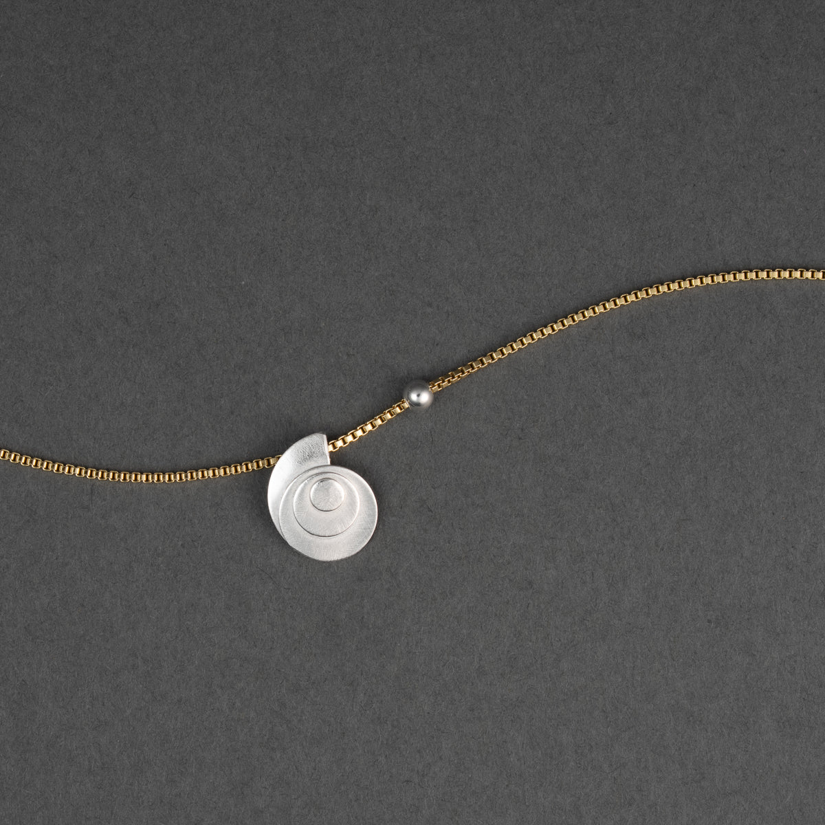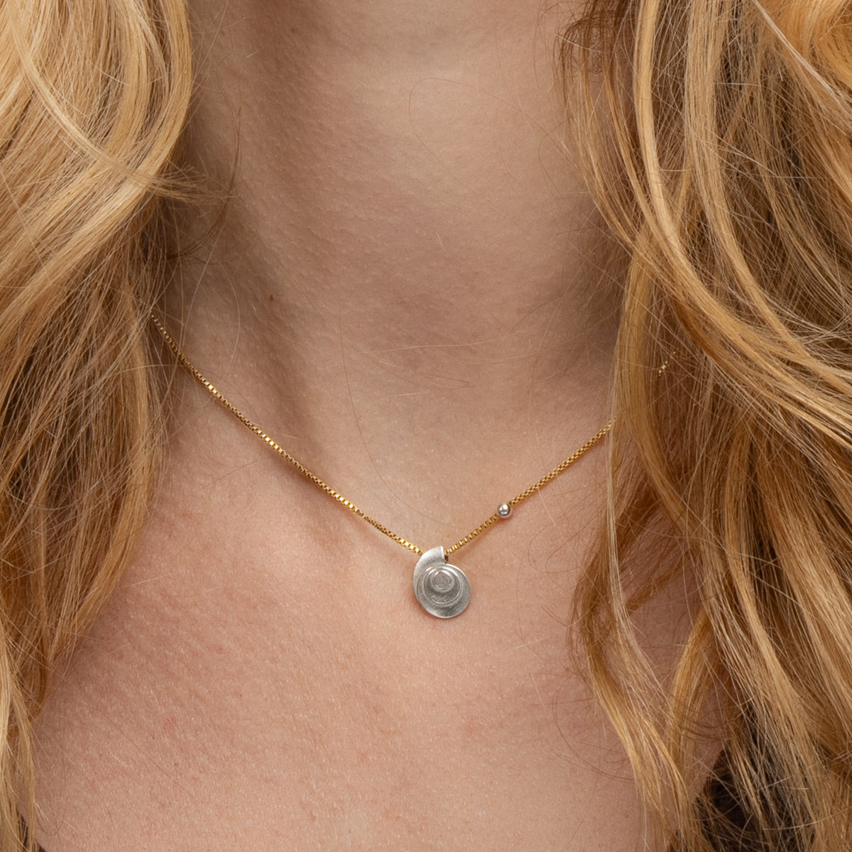 This sweet shell charm and silver bead slide across the gold-fill box chain. The charm has a delicate matte texture, creating a luminous aura like the light at dusk or dawn. It is 1/2" wide and 3/8" tall.